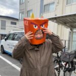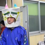 頭には手作りの鬼や福のお面。